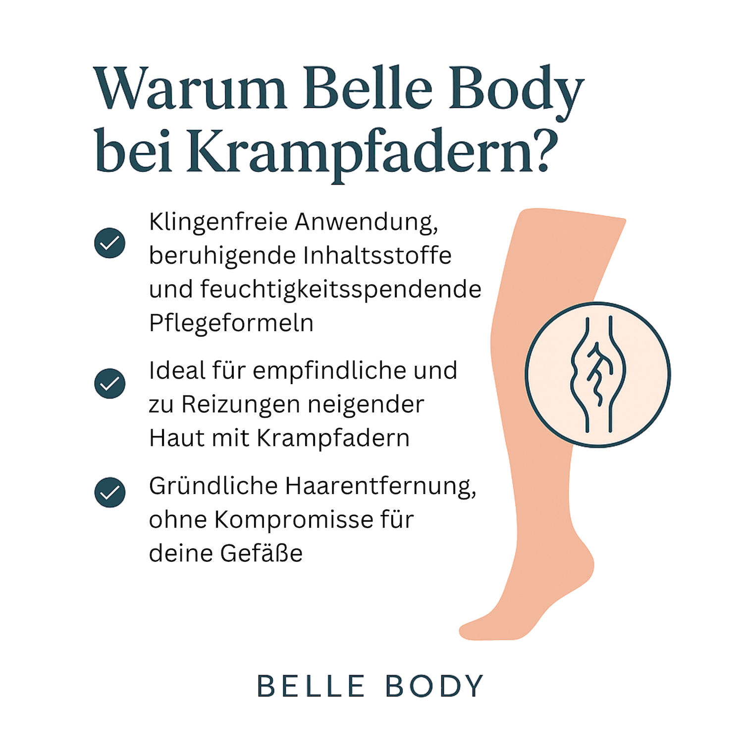 Die Produkte von Belle Body wurden speziell für empfindliche und zu Reizungen neigende Haut entwickelt. Dank ihrer klingenfreien Anwendung, beruhigenden Inhaltsstoffe und feuchtigkeitsspendenden Pflegeformeln sind sie ideal für alle, die unter Krampfadern leiden.